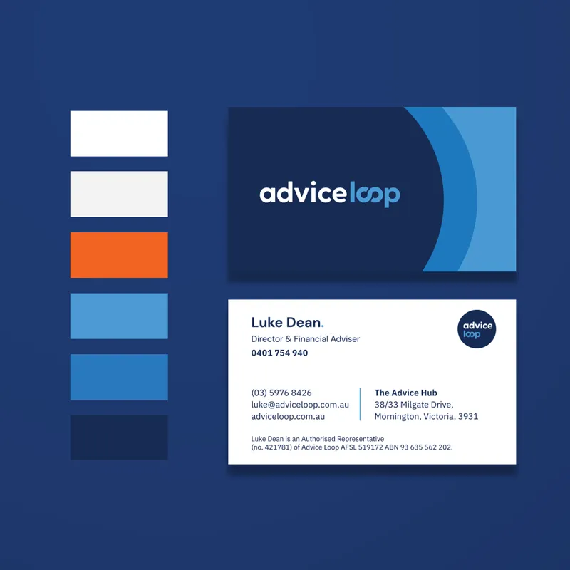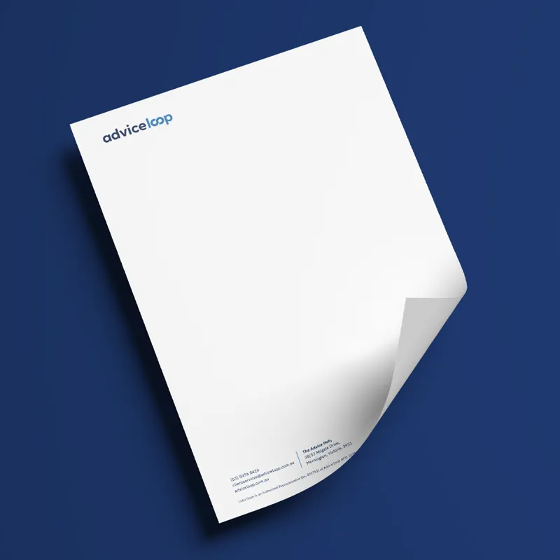 Our approach? We focussed on Advice Loop's unique point of difference when developing their strategy and new brand identity. The firm is self-licensed, which means that clients receive bespoke advice and solutions tailored to their unique financial goals. This USP was a game-changer, as not many financial advisors offer such a customised service. Naturally, we did what we could to exploit this. We developed a new logo and branding, featuring rounded, bold, lower-case typography to communicate warmth and approachability, and a warm, navy blue colour palette to exude trust and professionalism.