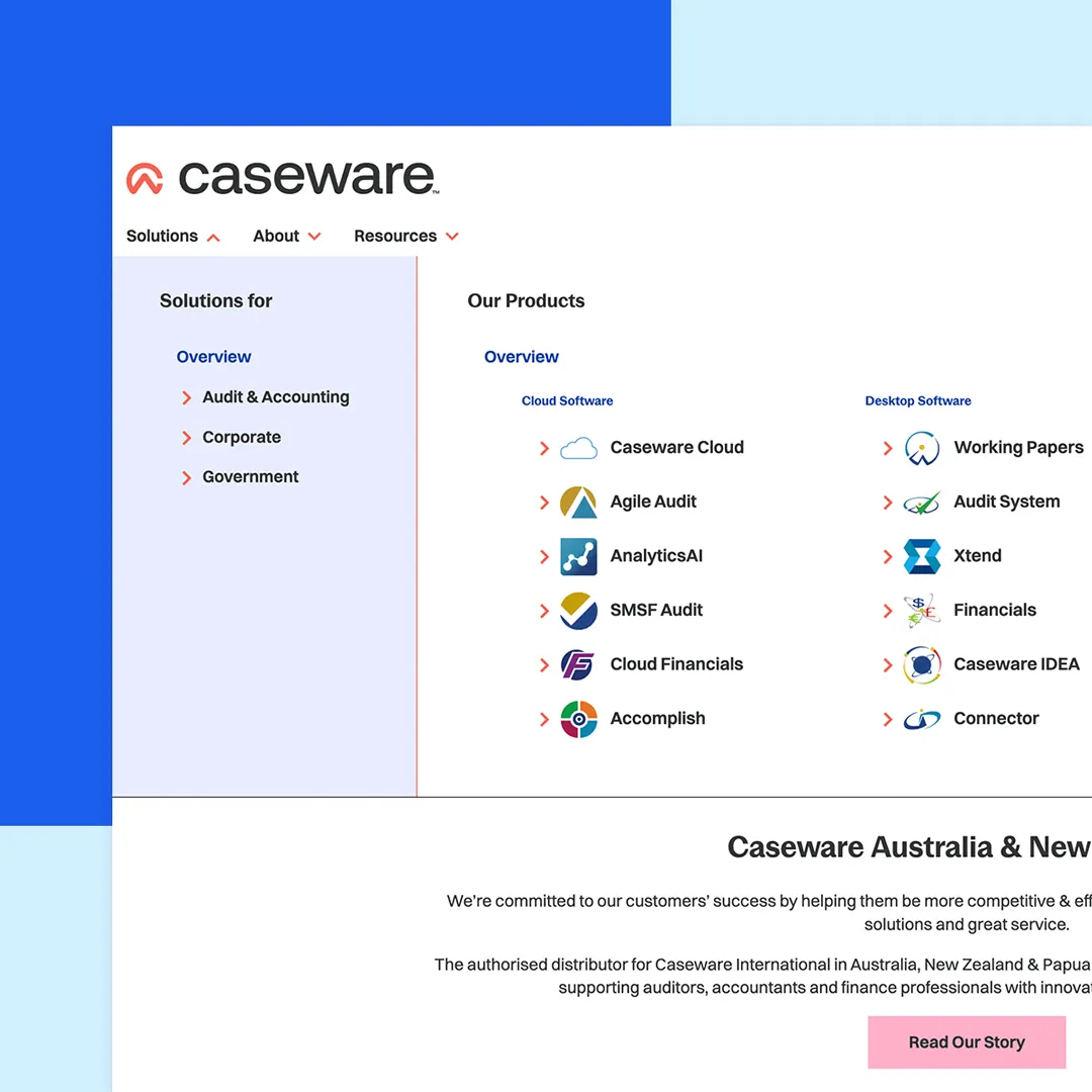 software solutions and support for financial professionals in the audit and accounting, corporate and government industries. In 2020 we embarked on a redevelopment project with Caseware’s marketing team to improve the site’s user experience and presentation of information, led by the unique needs and priorities of customers. Then, in 2022, we were again approached by Caseware to help them reskin the website following a rebrand.